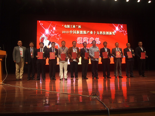 2013中國新能源產業十大科技創新獎頒獎典禮于10月19日在山東棗莊會展中心隆重舉行,工信部節能與綜合利用司資源綜合利用處處長黃健忠、棗莊市政府副市長張兵與中國電源工業協會理事長季國平、北京大學教授其魯分別向獲得十大科技創新獎及十大管理創新獎的企業或企業家頒獎。
