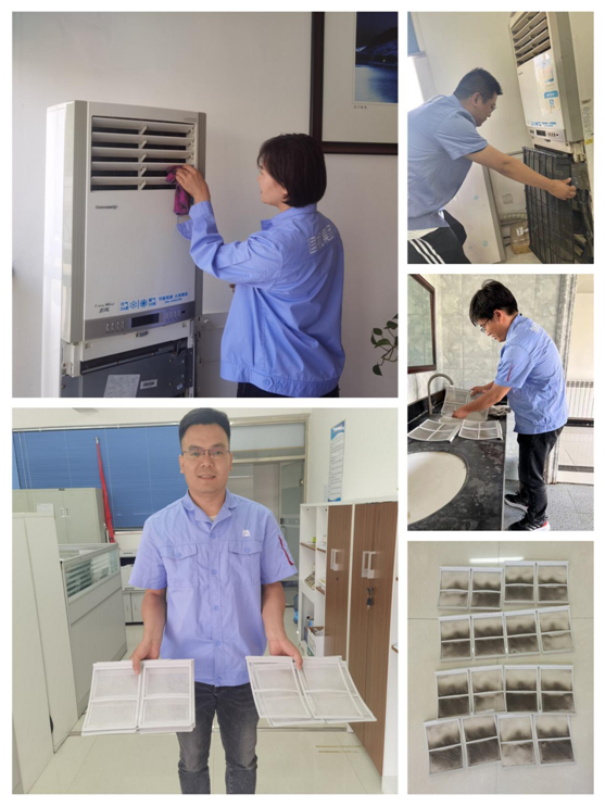 在活動現(xiàn)場,志愿者們分工明確,配合密切,拆卸空調(diào)外殼、清洗空調(diào)濾網(wǎng)、擦拭空調(diào)外機,經(jīng)過一下午有條不紊的清洗活動,辦公室和會議室的空調(diào)從內(nèi)到外煥然一新?!皼]想到空調(diào)濾網(wǎng)這么臟”“太好了,終于能放心開空調(diào)了”,看著沖洗出的灰塵污漬,員工們對志愿者助人為樂、無私奉獻的精神紛紛表示感謝和贊揚。